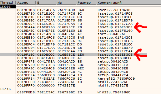 I have no doubt that your well-trained eye immediately recognizes a recursive call of virtual machine subroutines (repeating patterns in the stack are marked by arrows). In addition, it becomes clear which library contains this virtual machine: the issetup.