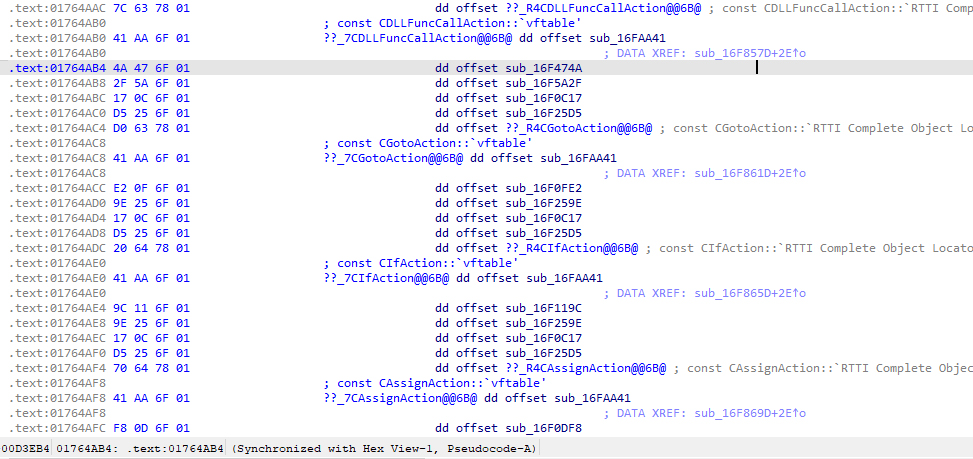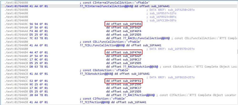 At this point, let’s stop examining specific features of the threaded code and get back to the subject. Now that you have an understanding of the threaded code structure, it will be much easier to deal with the native code. You have explicitly identified virtual function tables for each action of the interpreter embedded into the installation script, and the address of the function executed during the code interpretation is located at offset 4 from the beginning of each action (red frames in the screenshot below).