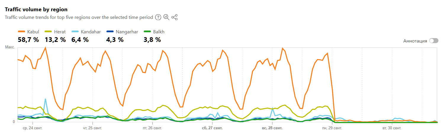 Taliban representatives (designated a terrorist organization and banned in the Russian Federation) began imposing the first shutdowns several weeks ago. In mid-September, the authorities shut off fiber-optic internet in the northern and eastern provinces, including Balkh, Baghlan, Badakhshan, Kunduz, Nangarhar, and Takhar.