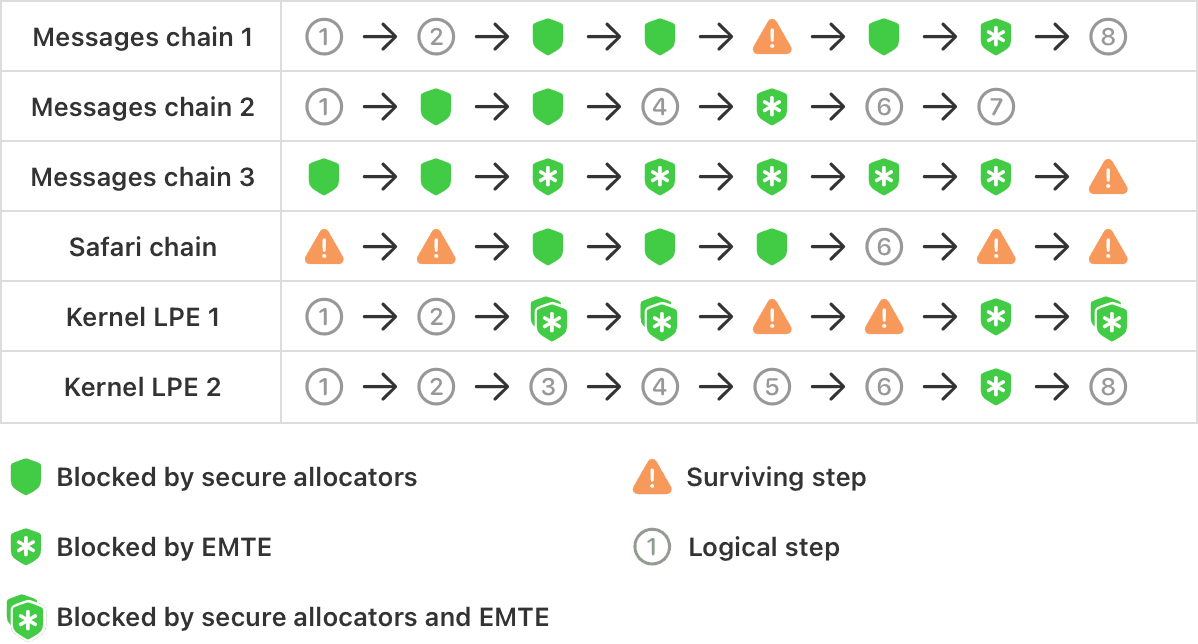 After testing MIE against known exploit chains and newly discovered vulnerabilities, Apple specialists concluded that the protection is effective at blocking attacks in their early stages, preventing attackers from “fixing” exploit chains by swapping one bug for another.