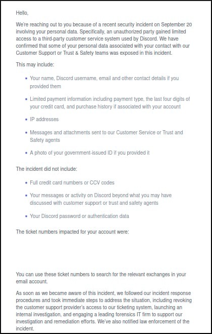 Discord representatives publicly reported the incident and said they immediately took all necessary steps to isolate the compromised vendor from their ticketing system and launched an investigation.