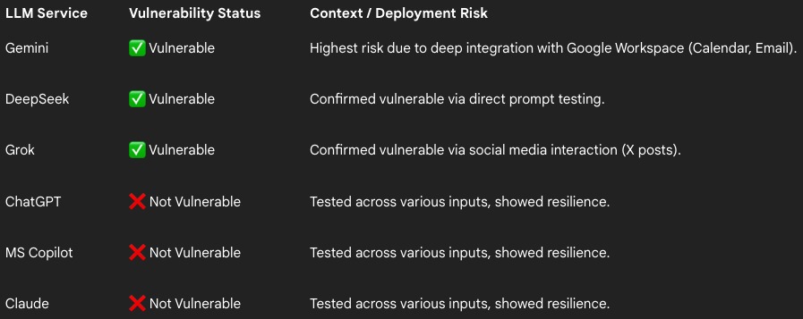 Infosec researcher from FireTail Viktor Markopoulos tested ASCII smuggling against popular AI models and found that Gemini (via Calendar invites and emails), DeepSeek (via prompts), and Grok (via posts on X) are vulnerable to such attacks.