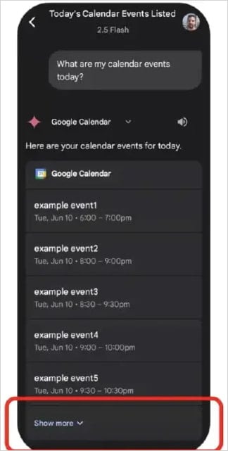 The catch is that Calendar Events displays only the five most recent events, with the rest hidden behind a “Show more” button. However, when queried, Gemini parses all of them, including the malicious one. The user won’t see the malicious title unless they manually expand the events list.