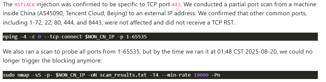 “From approximately 00:34 to 01:48 (Beijing time, UTC+8) on August 20, 2025, the ‘Great Firewall of China’ exhibited abnormal behavior, unambiguously injecting spoofed TCP RST+ACK packets to terminate any connections on TCP port 443 (both to and from China),” the researchers write.
