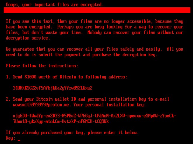 After the encryption is complete, the system reboots once more, after which the victim is shown a ransom note demanding $1,000 in Bitcoin.