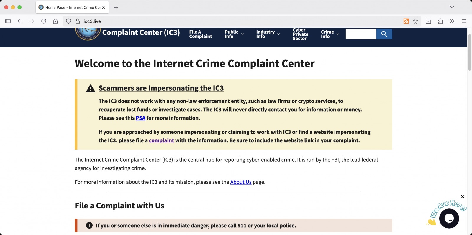 Although the FBI did not provide links to domains impersonating IC3, journalists at Bleeping Computer discovered several such examples: icc3[.]live, practicinglawyer[.]net, and ic3a[.]com. Moreover, the first site even displays the exact same warning about scammers as the real Internet Crime Complaint Center website, cautioning that criminals are posing as IC3 staff and offering victims “help” in recovering stolen funds.