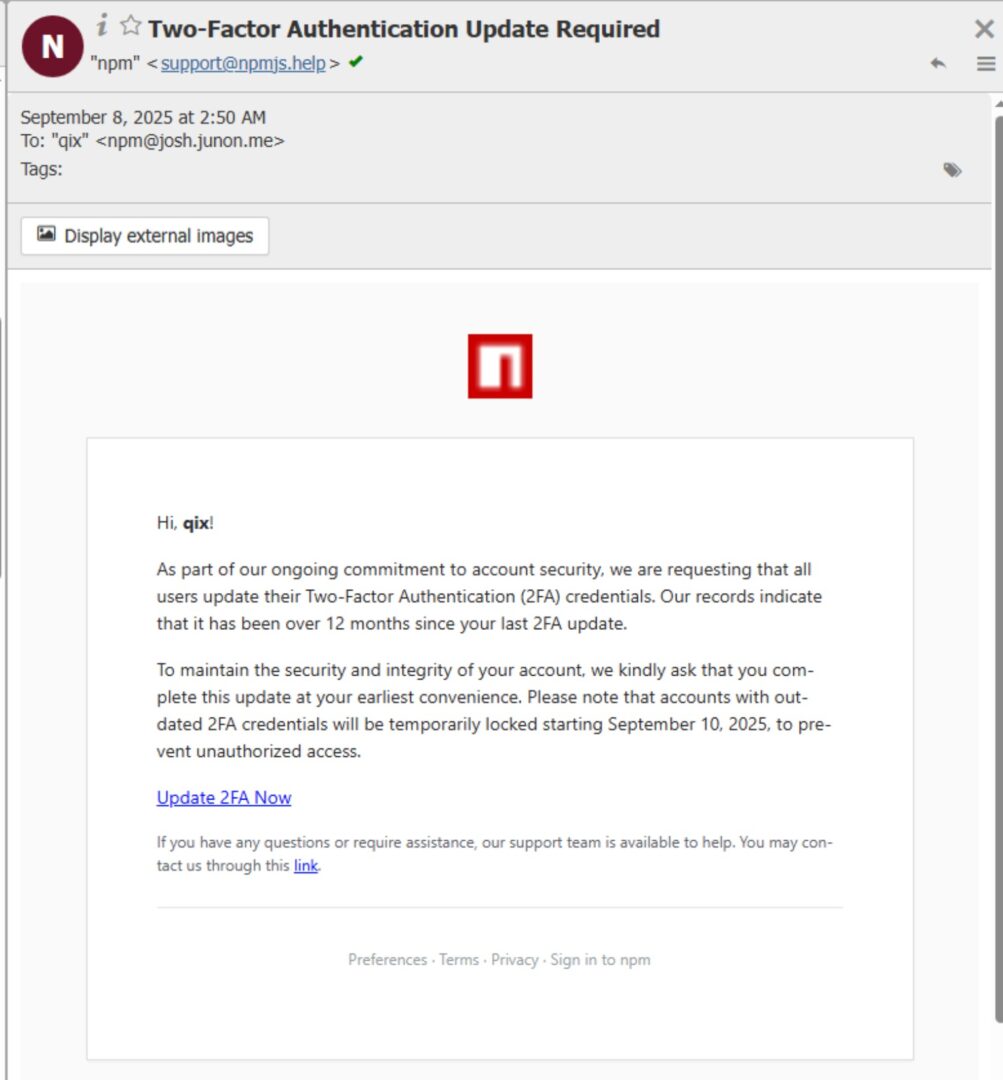 In the emails, which other maintainers also received, the attackers claimed that the account would supposedly be blocked on September 10, 2025, unless immediate action was taken.