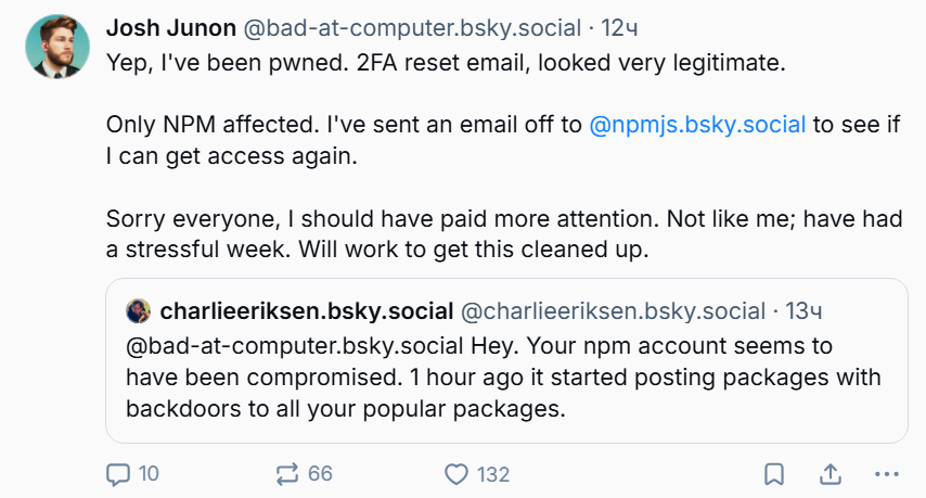 On the evening of September 8, 2025, maintainer Josh Junon, also known by the handle Qix, reported that his accounts had been taken over during an attack and that he was aware of the compromise.
