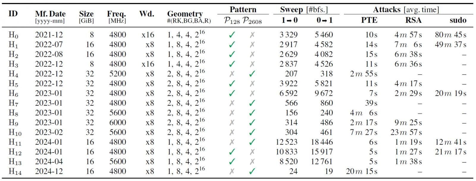 As can be seen from the table above, all the tested memory chips were vulnerable to at least one of the Phoenix Rowhammer attack patterns. The shorter pattern with 128 refresh intervals proved more effective and, on average, generates more “bit flips.”