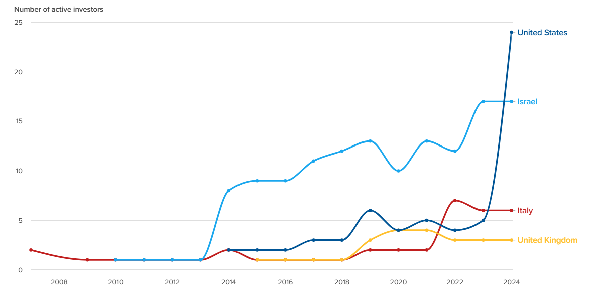 It is noted that American investors show the greatest interest in spyware: in 2024, 20 new investor companies were identified in the U.S., bringing the total to 31. This growth has significantly outpaced other countries, including Israel, Italy, and the United Kingdom.