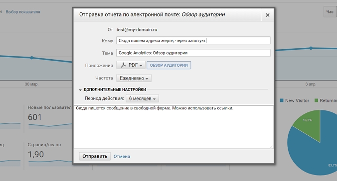 Let me share a very recent case—from April 2018. I started receiving spam at several of my addresses from the Google Analytics sender noreply-analytics@google.com. After digging into it a bit, I figured out the method they were using to send it.