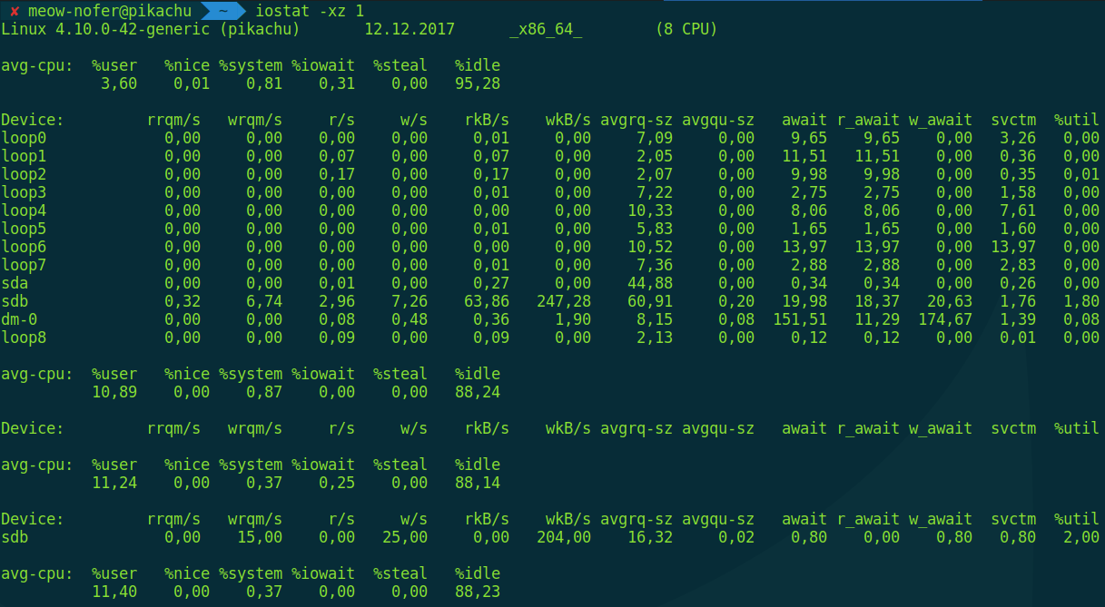 Here’s the catch: that holds for UNIX, but not for Linux. At first glance everything seems fine: if the numbers go down, load is decreasing; if they go up, it’s increasing. If it’s zero, the system is idle; if it equals the number of cores, that suggests ~100% load; if you see tens or hundreds… wait, what? Strictly speaking, Linux counts not only processes in the RUNNING state but also those in UNINTERRUPTIBLE_SLEEP—i.e., blocked in kernel calls. That means I/O can drive those numbers, and not just I/O, because kernel calls aren’t limited to I/O. I’ll stop here; for more details, see these two articles: “Как считается Load Average”, “Load Average в Linux: разгадка тайны”.