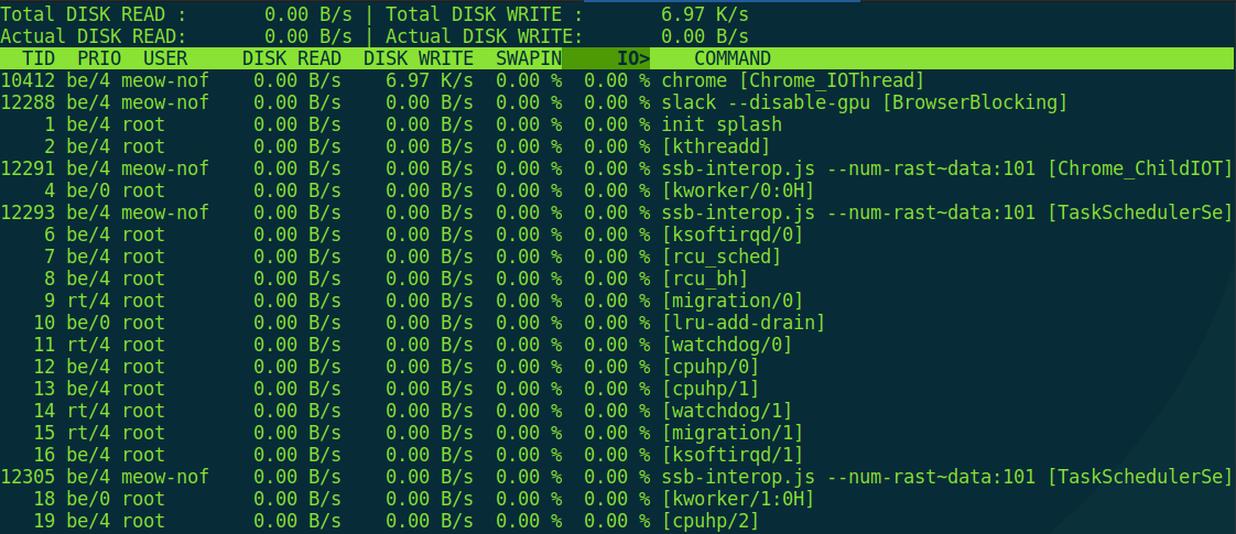 This command displays the average read/write operation counts for all block devices in the system, updating once per second. These are more “hardware-level” metrics, so there’s another command for per‑process I/O statistics, aptly named iotop.